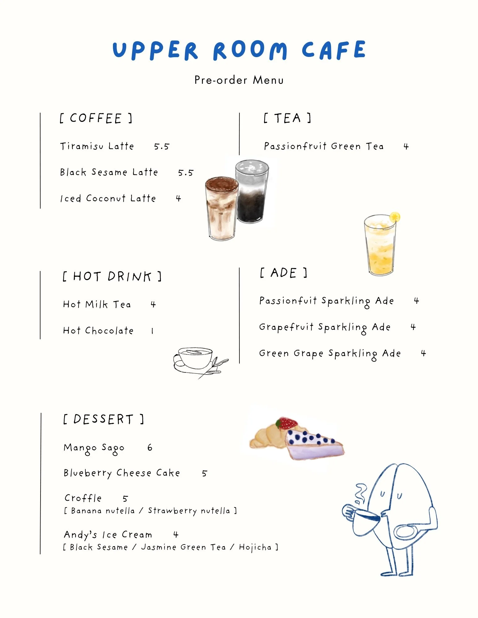 Our menu was divided into five categories: Coffee, Tea, Hot Drinks, Ade, and Dessert.